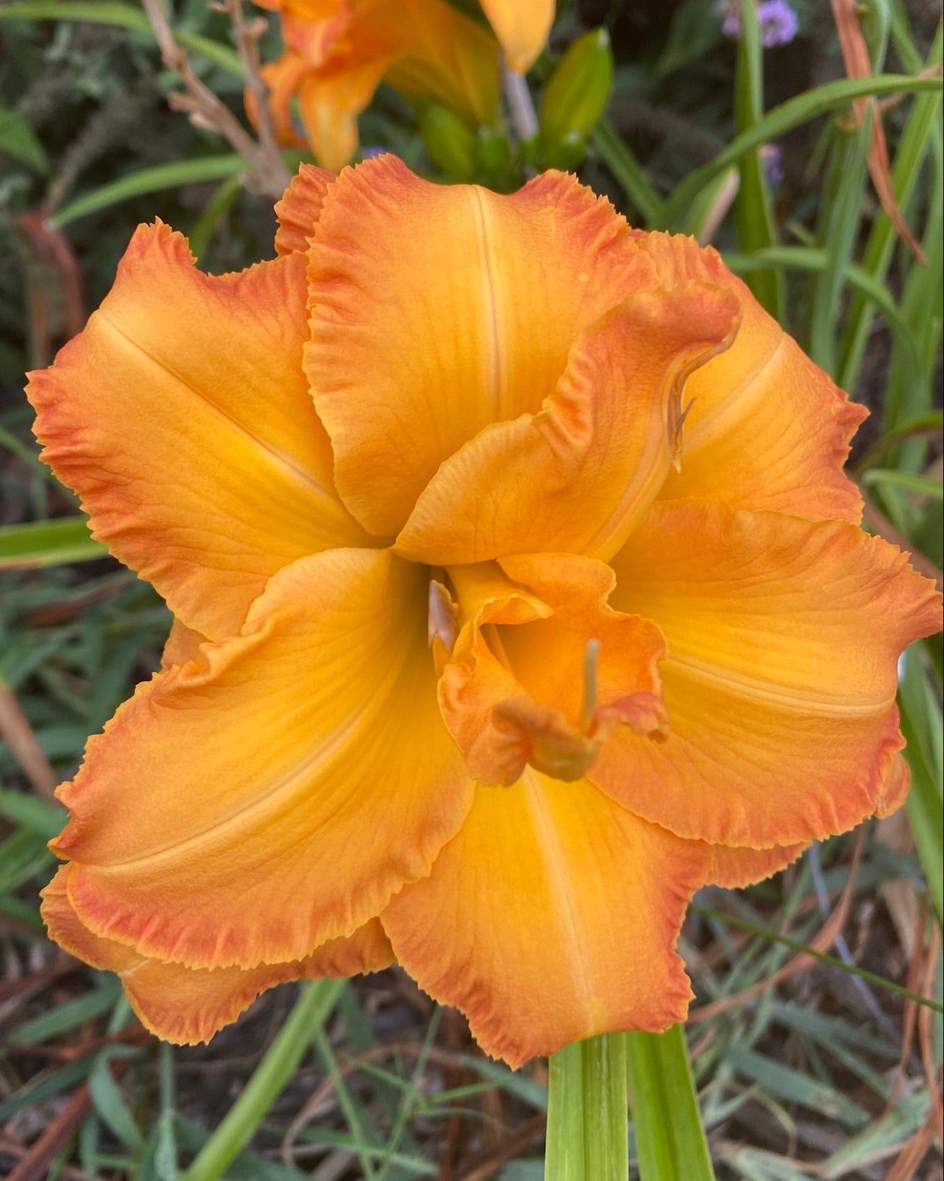 height 24 inches (61 cm), bloom 5.5 inches (13 cm), season MLa, Rebloom, Dormant, Diploid, Very Fragrant, 20 buds, 3 branches, Double 100%, Red orange with darker ruffled edge, rose eye, yellow throat, cream midribs, diamond dusted .. (sdlg × sdlg)