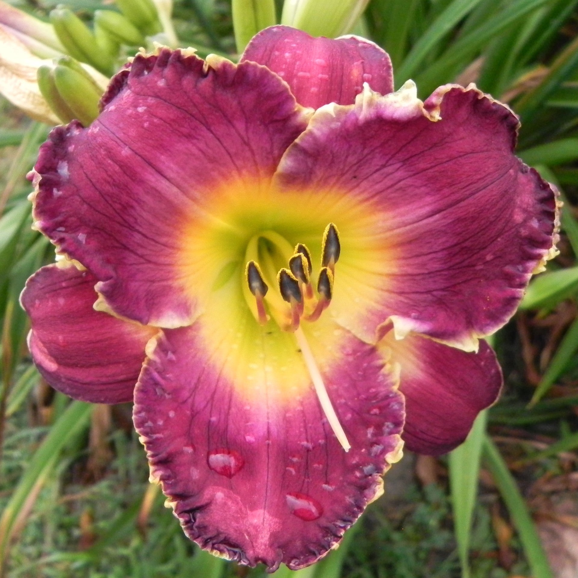 height 34 inches (86 cm), bloom 4.25 inches (10 cm), season M, Semi-Evergreen, Tetraploid, 33 buds, 6 branches, Ruby red purple with slightly lighter watermark, thin gold bubbly and toothy edge on petals, and yellow to green throat.. (Playing with Sharks × Tupac Amaru)
