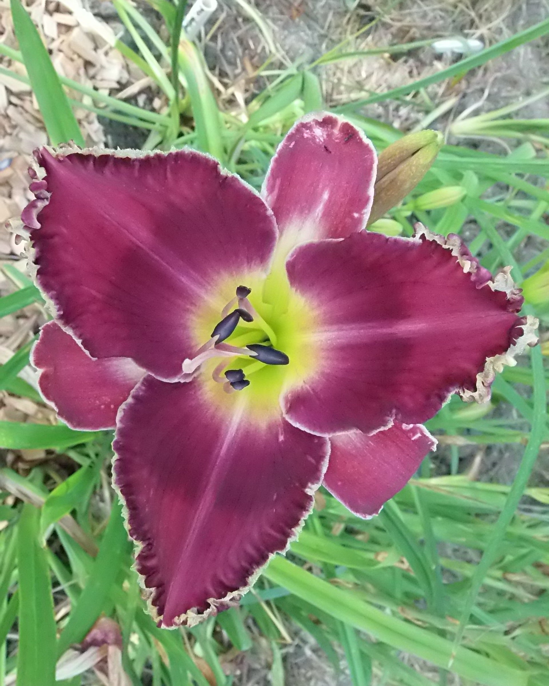 height 28 inches (71 cm), bloom 6.75 inches (17 cm), season M, Evergreen, Tetraploid, Fragrant, 12 buds, 3 branches, Purple with a wide darker purple band on petals, slightly lighter purple sepals, green throat, and white metallic ruffled edge.. (Undercurrent × God Save the Queen)