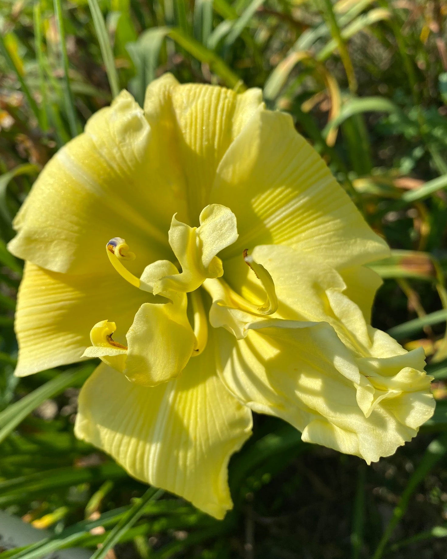 height 36 inches (91 cm), bloom 7 inches (17 cm), season M, Rebloom, Semi-Evergreen, Diploid, Fragrant, 18 buds, 3 branches, Sculpted Cristate, Relief, Double 80%, Soft yellow with cream midribs and pink blushed sepals, green throat, bud builder, pod and pollen fertile.. (Dindi × King Kahuna)