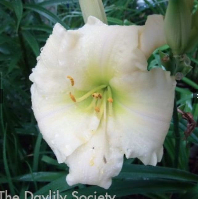 height 28 inches (71 cm), bloom 5.5 inches (13 cm), season M, Rebloom, Dormant, Diploid, Very Fragrant, 14 buds, 3 branches, Cream with wide ruffles, large green throat, white midribs, recurved.. (unknown × unknown)